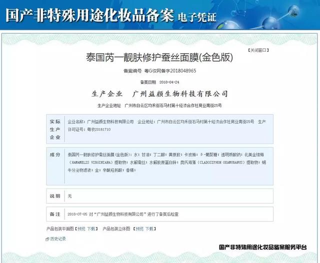 这家公司好奇可以去百度搜搜,看看结果就知道这是什么样一家公司了。 这两款面膜的备案都是2018年4月,也就是今年才进入国家备案,而这款面膜什么时候开始卖的,你们自己可以回忆一下。我记忆力一两年前朋友圈就开始在卖了,那么这些卖的人到底从哪儿弄的货?不用我说你们也应该差不多清楚了。 金色银色两款的成分我看了下,差别不大,分两款大概就是个噱头,也还好没有什么违禁成分出现,都是水、甘油、丁二醇、透明质酸、卡波姆这些耳熟能详的成分。 关于面膜,我也写了很多篇,不仅是从自己主观使用还是测评的客观分析来看,想借助面膜来补水、保湿、变白、去痘印、抗衰老等等等代购说的这些功能,效果是微乎其微的。 旧文复习丨你的皮肤真的需要面膜吗? 你还用面膜?教科书级评测中、日、韩9款网红面膜,原来这么多都汞超标!我猜你都用过! 之所以面膜这么受欢迎,是因为面膜的速效效果很明显,刚敷完皮肤会特别的白嫩,而时间仅仅只需要10-20分钟而已。 经常敷面膜的人难道没有观察过自己的皮肤吗?敷完面膜之后的好皮肤仅仅维持不到一天,甚至你熬夜了维持不到2小时,这就是你们要的补水效果? 而用美白面膜变白的,要不就是有激素的面膜,要不就是即时的白,很快又会变回去。更没有听过用了什么面膜,满脸皱纹就没了的。 这样即时的效果,比较适合出席重要场合,比如结婚、面试,而平时上个班,遛个狗,买个菜的,完全没必要每天敷面膜。 如果你说,我敷了那么久的面膜,实在戒不掉,可以,买瓶百岁山,买点化妆棉做水膜,既没有香精防腐剂,也没有增稠剂等乱七八糟的添加物,我保证你用完效果和你平时用的面膜效果是一样的。 最后,顺带提一下最近比较火的泰国另外一款面膜——安娜贝拉海藻面膜。这款面膜也很多人问我值不值得买,但是也已经有一大批人买过跟我反馈难用的要死。