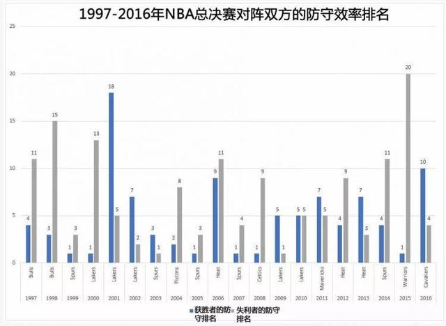 长期以来,联盟都有这样一种趋势:要想夺冠,必须具备前10的防守,回顾上赛季克利夫兰的首冠征途 这点再次得到应验,不过骑士只是勉强踏进了合格线,NBA官网的数据指出,上赛季他们的防守排在第10位。 “防守制胜”的论调可能夸张了一点——过去的20个总冠军里,仅有6支队伍的防守效率值是联盟最高的——但可以肯定地说,没有起码的坚固防守作保证,你很难赢得总冠军,这无疑成为一个令骑士担忧的因素,他们的防守已经来到了第23的位置。 追溯历史 对于一支志在卫冕的球队来说,这是个极不好的征兆。下图展现了近20年的总冠军,以及他们和对手的防守效率排名: