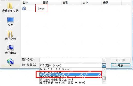 2、在弹出的“打开”窗口中找到 .WPS 文件的位置,然后在“文件类型”中选择“WPS 文件(*.wps)”,单击“打开”按钮,即可在Word中打开WPS的文件。