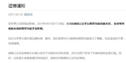 苹果和微信最终还是打起来了,自媒体平台却成了炮灰! 4月19日下午,苹果iOS版微信公众平台赞赏功能将被关闭,安卓等其他版本微信赞赏功能不受影响。