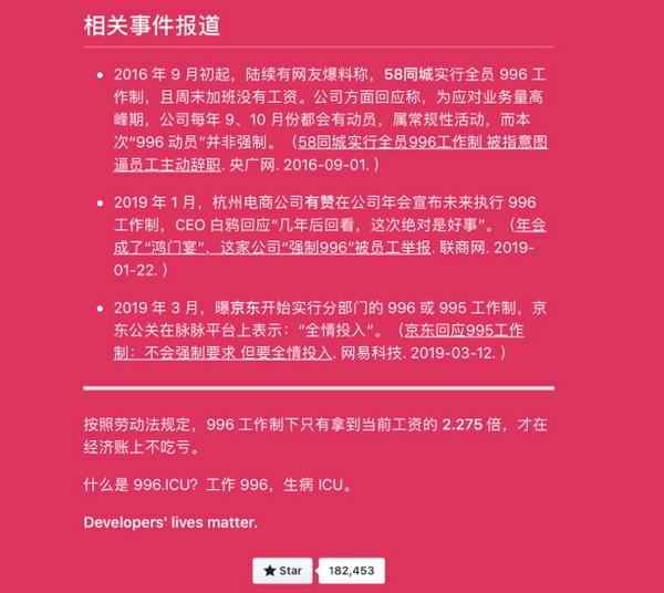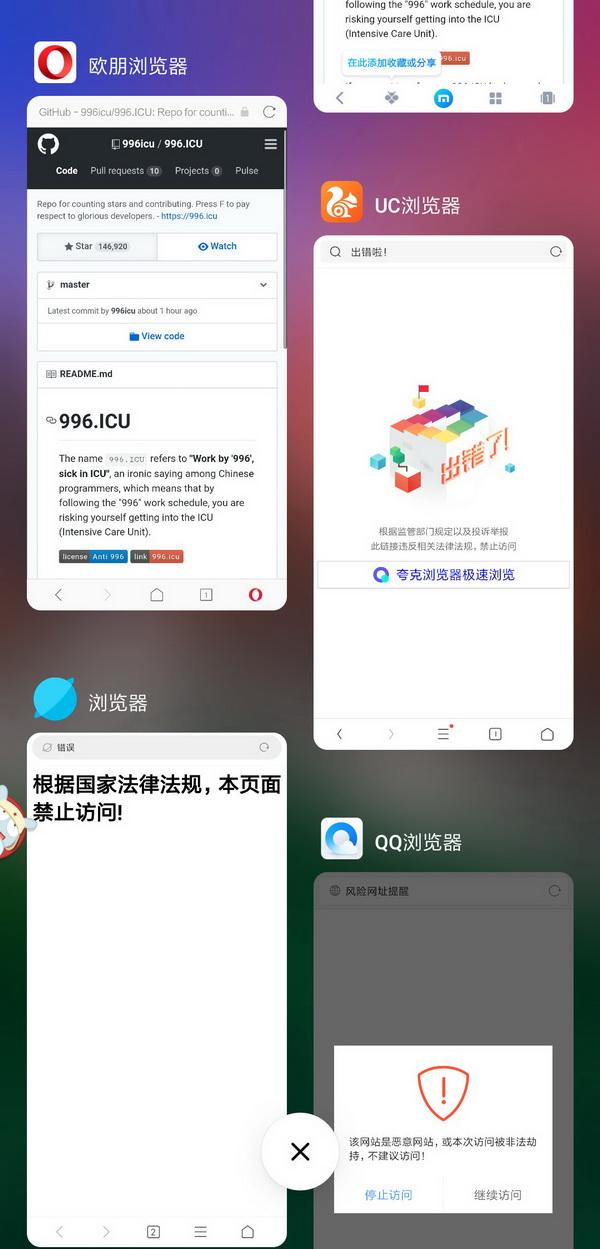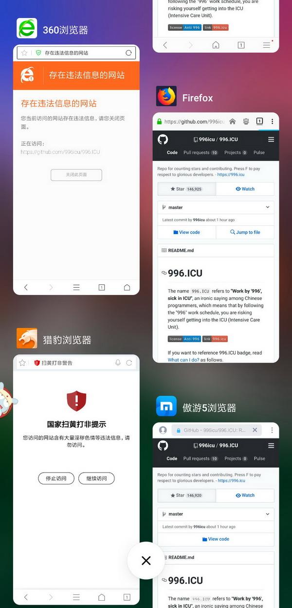 程序员们的愤怒 目前,“996.ICU”已在GitHub上获得超过18万星标,在一些法律专家的帮助下,还有程序员制作了一个反“996”工作制的开源许可证,这将能影响到一些公司使用部分开源软件的权利。 4月8日,亦有程序员在GitHub上表示,已向中华全国总工会、人资和社保等劳动相关部门递交了公开信,希望能够推动政府采取措施,谴责“996”等非法加班风气、开放举报渠道,同时对执行“996”的企业展开调查。 抗议活动还从线上发展到了线下。4月1日,公众号“Shachiku东亚保健所”有成员头戴面具,角色扮演为“牲畜”那样跪在几家知名互联网公司的门口,表达对“996”工作制的抗议,并向阿里巴巴、爱奇艺、网易等9家公司投递了“关于设立‘拒绝加班日’的倡议书”。 然而,与此同时,微博用户@AweiLoveAndroid发博称,多家国产浏览器如QQ、UC、360等已经屏蔽了“996.ICU”的GitHub项目地址。当用户使用这些浏览器访问该地址时,会出现“出错”“该网站是恶意网站”“本次访问被非法劫持不建议访问”甚至“该网站含有大量淫秽色情等违法信息”等提示。