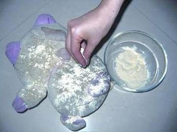 将毛绒玩具和粗盐都放在袋子里使劲的摇,摇了一段时间,就可以发现,这些可爱的娃娃变干净了,但是倒出来的盐却脏了,这就是吸附了污渍的结果,这个效果对于那些不好洗的娃娃可以说是很有用处了,也可以洗的很干净,就是有点咸,为了这个回避掉这个咸味我又开始找其他的办法。