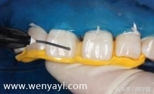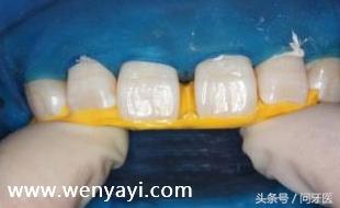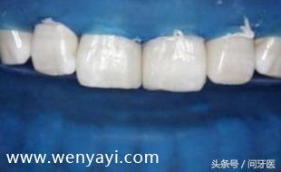 清洁牙面,在牙齿需要粘接的地方,涂抹酸蚀剂,并冲洗干净,如下图: