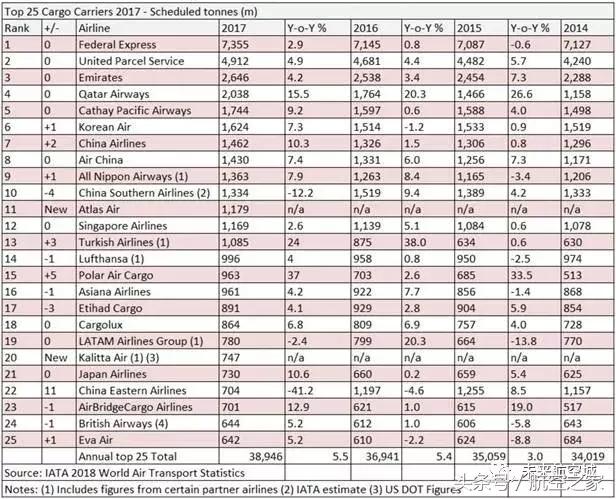IATA的报告显示,由于货运需求增长,25大货运航空公司中的绝大部分在2017年的货运量都有所增长。25家航司的总货物吨公里(FTK)达到1665亿,同比增长7.2%。 联邦快递2017年的货物吨公里(FTK)达到168亿,同比增长7.2%,再次成为全球最繁忙的货运航司。联邦快递在年度财报中称,于2016年中期收购的TNT快递(收购价格为49亿美元)促进了该航的运营。 目前联邦快递正在为未来的增长做准备。2017年中期,联邦快递订购了12架波音767F货机和12架波音777F货机,这些订单的总标价达66亿美元。 根据计划,波音777F货机将在2021年财年和2025年财年间交付,而波音767F货机将在2020年财年和2022年财年间交付。 中东航企增长减慢 阿联酋航空在25大货航榜单中位列第二,仅次于联邦快递,同时单就货运航司来说排名第一(联邦快递首先是快递公司)。2017年,阿联酋航空的货运吨公里(FTK)为127亿,同比增长了3.6%。 这个增速是25大货运航司中最低的,同时也反映出阿航接收新飞机的速度和中东货运航司的需求增长都减慢的事实。 IATA在年度市场报告中称:“2017年上半年,中东地区并没有其他区域那样增长强劲的需求,所以中东地区货运航司的全球需求比例在18年来首次出现下降。” 另一家快递巨头UPS位列榜单第三名。UPS在2017年的货物吨公里(FTK)为119亿,同比增长了6%。 UPS表示,由于国内“直达客户”市场的结构性变化,其在美国的国内业务得到增长,因为消费者们会选择速度更快的运送方式,所以能次日到达的航空运输获得快速增长。此外,UPS国际市场的出口货运业务也实现了16%的日增长率。 UPS目前也在为未来扩张做准备。2017年2月,UPS增购了14架波音747-8F货机和4架波音767F货机,以提供额外运力应对增长的需求。此前在2016年,UPS已经订购了14架波音747F货机。 位列第四名的卡塔尔航空的增长率在25家航司中排第三。2017年,卡塔尔航空实现了快速扩张,总货物吨公里(FTK)达到了110亿,同比增长了19.3%。卡航在2016年和2015年的同比增长率分别为20.4%和27.7%。 雄心勃勃的卡航期待成为全球最大的货运航司(不包括联邦快递等快递公司),而其目前与第一名阿航的货物吨公里相差不到17亿。 2017年,卡航接收了2架波音747-8F货机和2架波音777F货机,在2018年又订购了5架波音777F货机。 国泰航空位列榜单第五名。2017年,国泰航空的货运量同比增长了7.8%,货物吨公里达到107亿。 2017年增速最快的货运航司是土耳其航空。土航2017年的货物吨公里(FTK)为47亿,同比增长了29.9%。在2017年,土航接收了2架波音777F货机。与此同时,土航也在迅速扩张客运机队,准备迎接即将开始运营的新伊斯坦布尔机场。 土航希望在2023年前跻身全球前五大货运航司。近几年,土航实现了不俗的增长,一路从2015年的未进入25大货运航司榜单发展到2017年的跻身榜单前15名。 除了已经在运营的2架波音777F货机外,土航在2018年初订购了3架波音777F货机,预期在今年内接收。 汉莎航空的下滑:运量增加,距离变短 在榜单上,汉莎航空是唯一一家出现负增长的航司。2017年,汉莎的货物吨公里(FTK)为74亿,同比下降了0.9%。 按单个航司计算,汉莎的货运量下降了。但就汉莎集团来说,汉莎航空占据的货运份额仅为68%,如果把旗下的其他航司也包括在内,汉莎集团在2017年的货运量实际增长了5.8%。 按照货物吨数来算(不同于货物吨公里数),汉莎航空的总运量相比去年也有所提高,这表明下降是因为货物运输飞行的距离更短,而不是总量更少。
