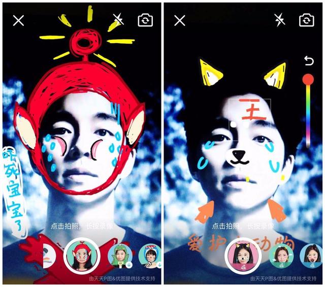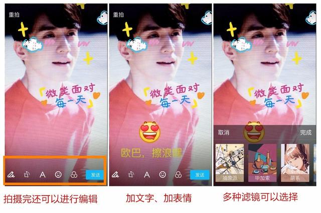 单击拍图片、长按拍视频,拍摄完之后还可以再进行编辑:涂鸦、裁剪、加文字、加表情等。