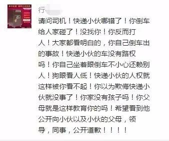 司机打人固然很狂妄,但快递小哥可能当时确实做得也不太对,在没有足够的空间下,趁他倒车空隙着急过去,这也反映了现在社会有少部分电动车在马路上横冲直撞,不遵守交通规则。但话又说回来了,车辆仅仅是擦伤,你就直接打人扇脸,真拿自个地位高是咋地!?