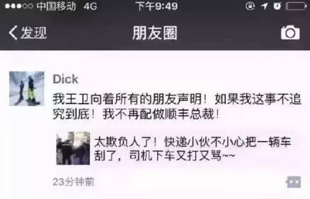 据网友爆料,顺丰老总王卫也发怒了,在朋友圈发消息称不追究就不配做总裁。先赞一个~