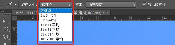 在选项栏后面,也可以设置取样所选择的图层,默认的是所有层,也可以设置成当前图层等。同时,在最后面,还可以设置是否显示取样环效果,如下图所示。
