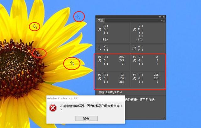 颜色吸取器,他可以在画面上创建一个吸取点,然后在信息面板(窗口—信息F8)中,显示RGB和CMYK的相应数值。一个文件里可以创建出4个颜色吸取的信息点。