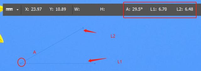 按住shift可以绘制水平标尺,按住alt键从端点拖拽出另一条标尺。属性栏显示L1和L2及夹角A。