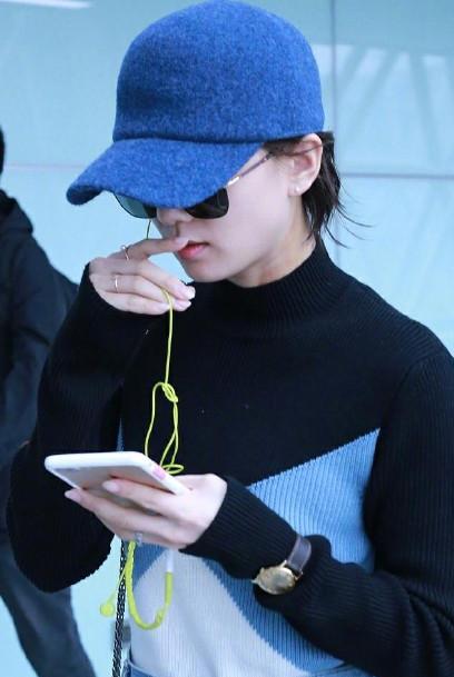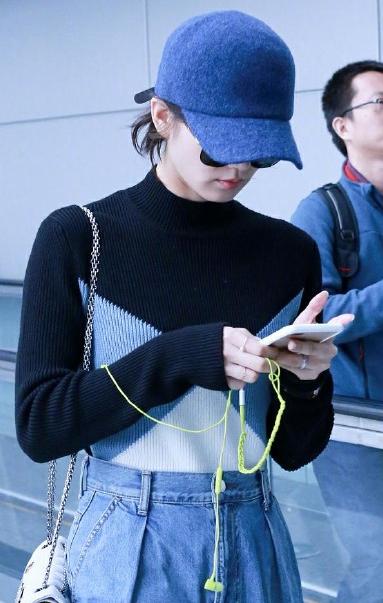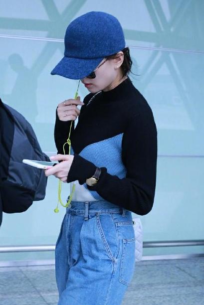 刘诗诗蓝色系穿搭现身机场 她身穿蓝黑撞色毛衣搭配牛仔裤,头戴蓝色鸭舌帽,将蓝色系都穿在了身上,清新靓丽。你们有没有被玩转蓝色系的刘诗诗撩到?