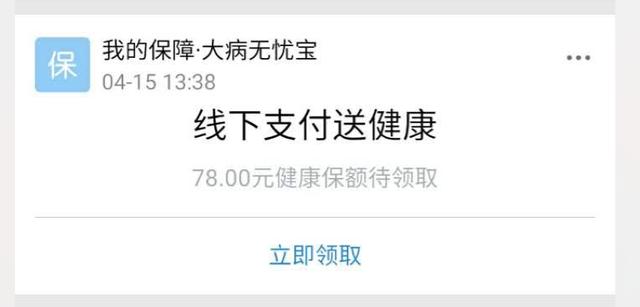 这是怎么回事呢,送的保险到底是什么,有没有价值还是鸡肋?很快,无马哥在群里已经看到不少朋友纷纷发问了。 果然,无马哥在支付宝的首页通知栏里,发现了这个新福利——“线下支付送健康”。