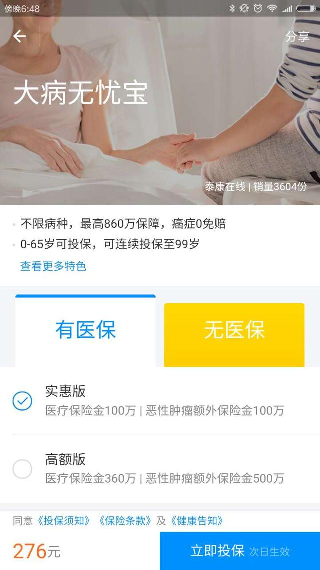 免费福利到手,我们来看看它到底是什么。 这款保险叫做“大病无忧宝(福利版)”,其实是支付宝的合作方,泰康在线推出的一款重疾险产品。这个产品有效期一年,可以保障25种最常见的重大疾病,立即生效,即领取后如果你患了这25种大病中的任意一种,可开始申请理赔。 上面截图中的大数字就是保险的保障金额。我们每天用支付宝线下付款的时候就可以领取一定的保险额度,一天最多领三次;如果当天有空气污染,还会再赠一次。 重疾险是人人都需要的重要健康险种,支付宝送的还挺及时,不过额度有点低。 于是无马哥点开了提升额度,结果进入了“大病无忧宝”保险购买界面