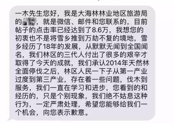 官方回应:存在价格欺诈,已处罚 1月3日下午,“一木行”发布了《关于雪乡无良店家欺客事件的后续声明》,晒出了雪乡旅游局工作人员的相关微信、短信记录。