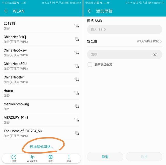 2.手机连接 打开wifi连接页面→添加网络→输入wifi账号和密码