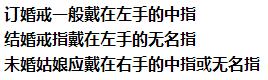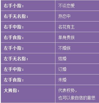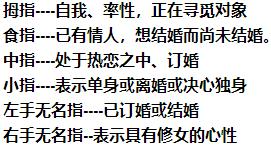 7、为什么要将结婚戒指戴在无名指上? 先将两手的中指向下弯曲,背跟背对靠在一起,其它4指指尖对碰 下面开始游戏的正题 1.请张开你们那对大母指,大母指代表我们的父母 2.请大家合上大母指,再张开食指,食指代表兄弟姐妹 3.请大家合上食指,再张开小母指,小母指代表子女 4.那么,请大家合上小母指,再试着张开无名指,无名指怎么也张不开---夫妻