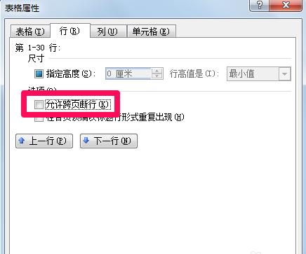 4.在word表格属性的行中,取消允许跨页断行,然后点击确定,此时可以看一下表格是否恢复