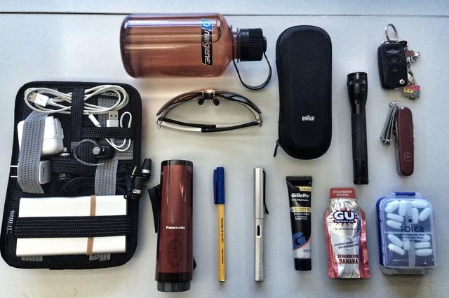 充电包;Nalgene水壶;Rudy墨镜;Braun剃须刀;Maglite手电;Victorinox折叠刀;小林制铁指甲刀;VW车钥匙;Panasonic冲洗器;Schneider圆珠笔;LAMY钢笔;Gillette洁面乳;GU能量胶;Centrum复合维生素。 冲锋小子 喜欢户外运动的盆友,我相信这只是他们EDC中的一小部分。