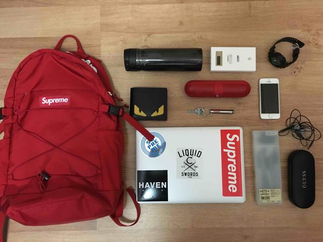 美国街头潮流王牌supreme家2016春夏季新款双肩背;MacBook Pro笔记本;beats的pill蓝牙音响;品胜的15000毫安充电宝;膳魔师的保温瓶;fendi的钱包;卡西欧G-SHOCK手表;supreme家2016春夏季的新品钥匙扣;MUJI笔盒;bose耳机;guess的眼镜。 普通业务员 这种EDC装备应该能适应80%的人群。