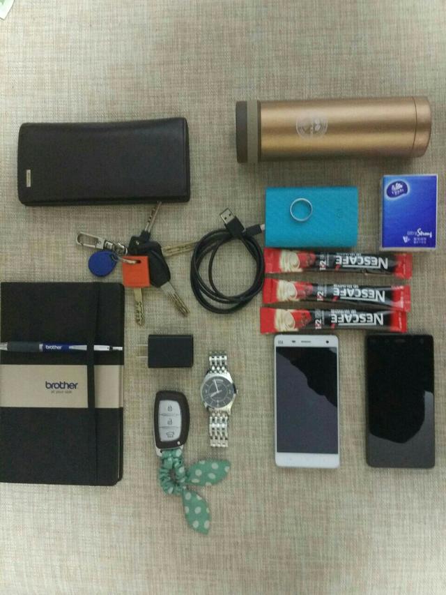 无名钱包;无名笔记本;乐扣水杯;雀巢速溶咖啡;两部小米4手机+小米移动电源;铂金素圈戒指;天梭手表;瑞纳车钥匙;维达纸巾。 市政工程技术负责人 这是比较专业路子的装备了,这个包得多沉啊!