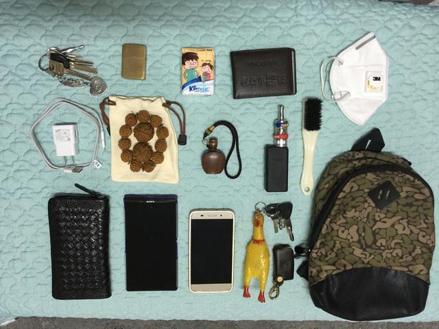始祖鸟随身包;apple watch;卡西欧;LED手电;多功能工具刀;耳机包;墨镜(近视);iPhone 6 Plus;坚果手机;妮维雅男士润唇膏;钢笔;笔记本;纸巾;5m盒尺;移动电源;sony运动相机;相机监视器。 玩儿文玩的 这种随时带一把刷子的,不是刷鞋的就是玩儿文玩的。兄弟你那只钥匙链鸡直接暴露本性了好不啦~