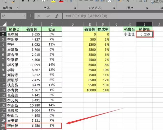 可以看到我们查找出来的结果是正确的,李佳佳的销售额是 6,250 那么这些就是VLOOKUP查找函数的使用方法,希望大家使用的时候能够分清模糊查找和精确查找