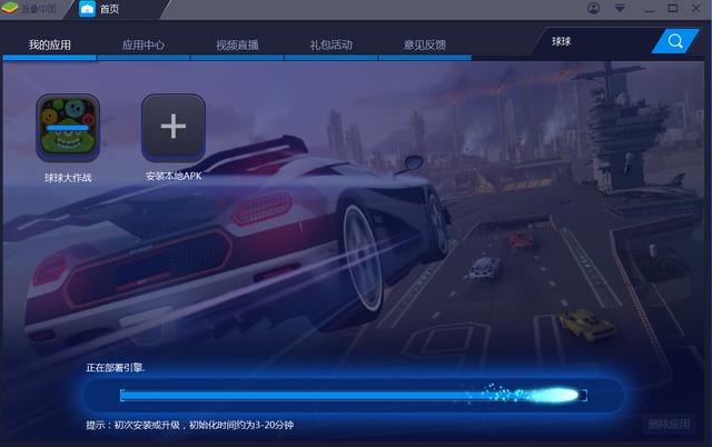 安装完成后,打开模拟器,先点击“应用中心”下载安装游戏,比如球球大作战。