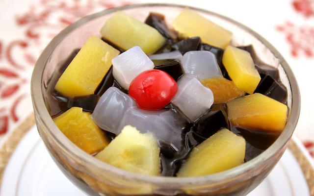 材料 龟苓膏粉20克,黄桃适量(其他水果也可以),蜂蜜适量,温水400克。 做法 1.先用少量温水将龟苓膏粉调成糊状,多用筷子搅拌一会,不能有疙瘩。 然后再放剩下的温水,再用筛子过滤两遍(这是为了做出来更爽滑哦)。 2.把和好的龟苓膏水放一个小锅里,放火上加热,一定要小火,边加热边搅拌,搅拌均匀,熬煮至粘稠透明状。 开始会有块状出现,搅拌一会就会很均匀了。 3.倒入碗中放入冰箱冷藏。 4.切成小块,黄桃也切块,再淋上蜂蜜,一道冰凉爽口,Q到极点的龟苓膏就成功了,还何以加炼奶和糖桂花,味道都不错哦。 做法五