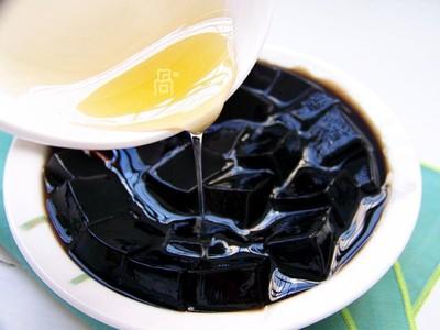 材料 凉白开水50g,龟苓膏粉100g,椰奶2大勺,开水250g,蜂蜜1大勺。 做法 1.将龟苓膏粉倒入碗中。 2.加少许凉开水,将龟苓膏粉充分调匀。 3.烧一壶开水,倒入碗中,一边倒一边用筷子迅速调匀。 4.然后将大碗放入冰箱,冷藏3小时以上,使其凝固。 5.取出凝固后的龟苓膏,切成小块,加入少许蜂蜜。 6.加入两大勺椰奶,调匀即可。 做法二