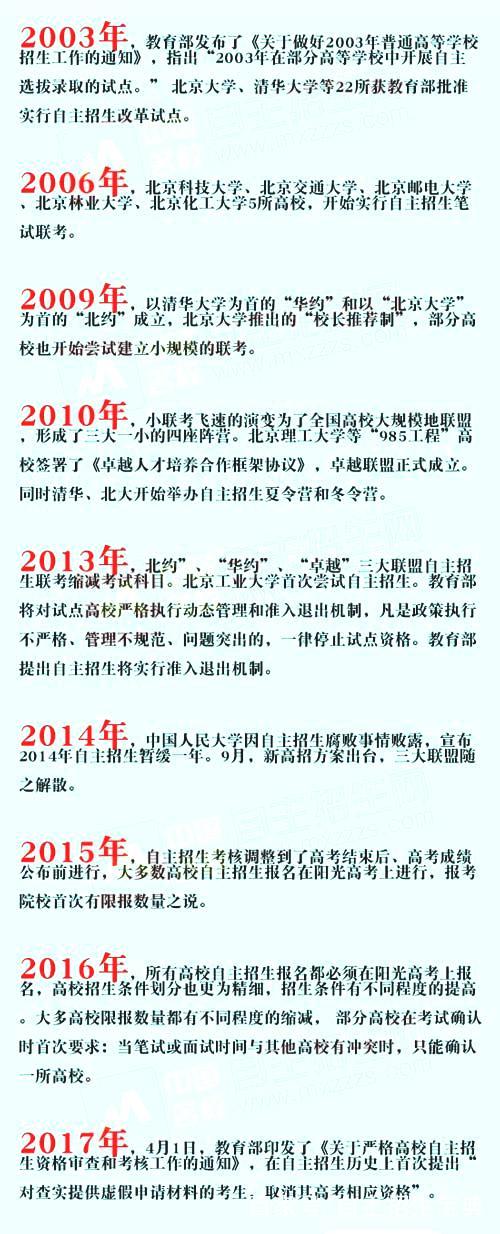 自主招生渊源 2003年,中国教育部开始推行自主招生,结束了此前高校只能在每年同一时间招考的历史。2014年11月,国务院发布《高考制度改革的意见》。2015年起,所有试点高校自主招生考核统一安排在高考结束后、高考成绩公布前进行。笔试考试不得超过两门,考核过程全程录像,以防作弊。历经13载,从最初的22所试点高校,到2018年已经有近百所试点高校开展自主招生。自主招生的地区发展差异