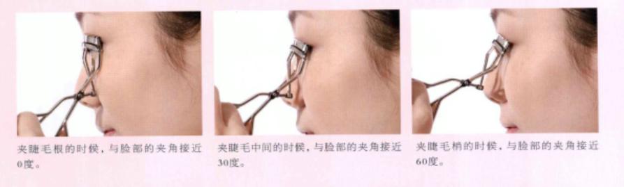 攻略二:夹出不同角度在三个不同位置的时候,一定要注意睫毛夹与脸部的夹角,这样才不会拉扯睫毛,而且夹出的睫毛会自然地弯曲上翘。