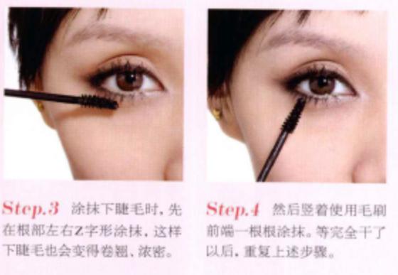 Step.3涂抹下睫毛时,先在根部左右乙字形涂抹,这样下睫毛也会变得卷翘、浓密。 Step.4然后竖着使用毛刷前端一根根涂抹。等完全干了以后,重复上述步骤。 化妆师师提示:别忘了用睫毛梳梳开枯连部位,如果不小心板眼使得下眼验粘到些毛膏,记得一定要等完全干了,用棉花棒擦掉。
