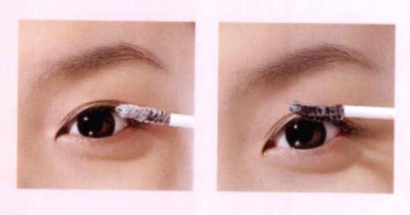 Step.l眼睛微微向下看,左右乙字形涂抹是关键,这样既能起到睫毛根浓密的效果,还能防止睫毛下垂。 Step.2从睫毛中间到睫毛桶,从内向外放射状涂抹,动作要慢,不要太快。