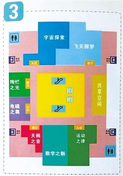 东区二层 东区三层:为“启迪与探索”展厅和“探索与发现”展厅,共有126件展项,主要包括“共享空间”、“运动之律、数学之魅、天籁之声”、“绚烂之光、电磁之奥”、“宇宙探索、飞天探梦”展区。