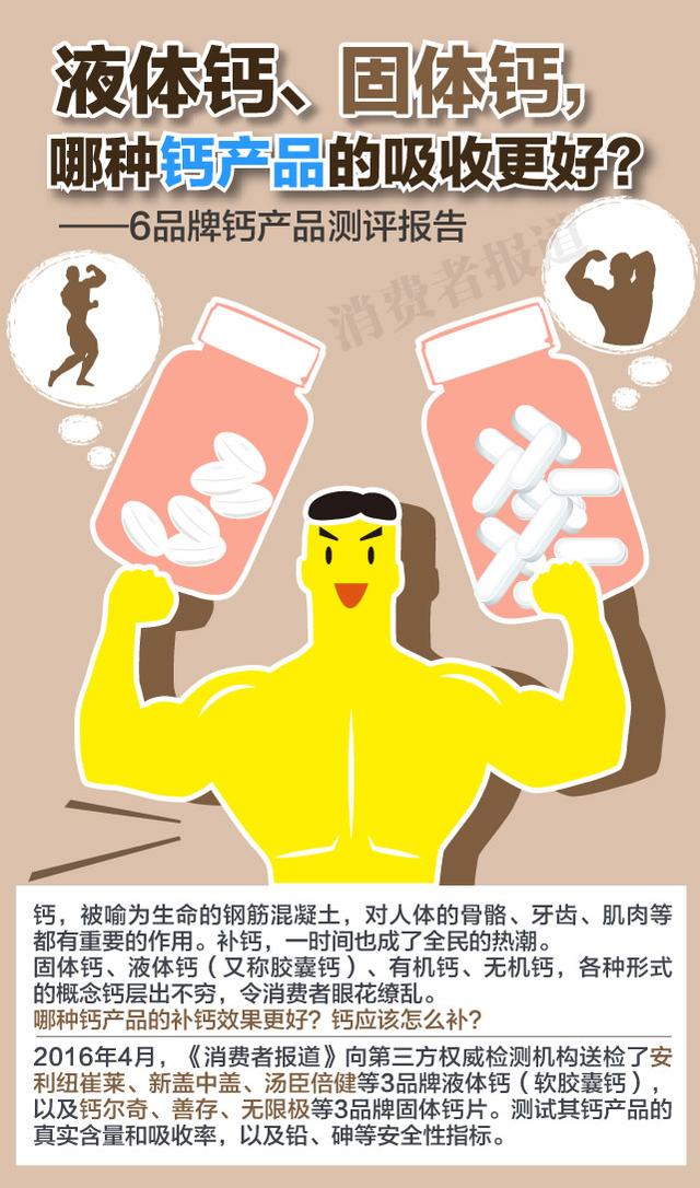 2016年4月,《消费者报道》向第三方权威检测机构送检钙尔奇、善存、汤臣倍健等3品牌液体钙(软胶囊钙),以及安利纽崔莱、新盖中盖、无限极等3品牌固体钙片。