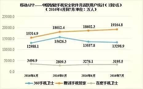 其中,2016年4月到7月,按照月活跃用户排名:腾讯手机管家排第一名,360手机卫士排第二名,百度手机卫士排第三名,猎豹安全大师和LBE安全大师依次排第四名和第五名。