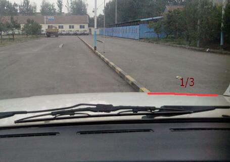 二、向左回方向后,观察路牙石到了车头的三分之一处时,马上将转向盘回正。