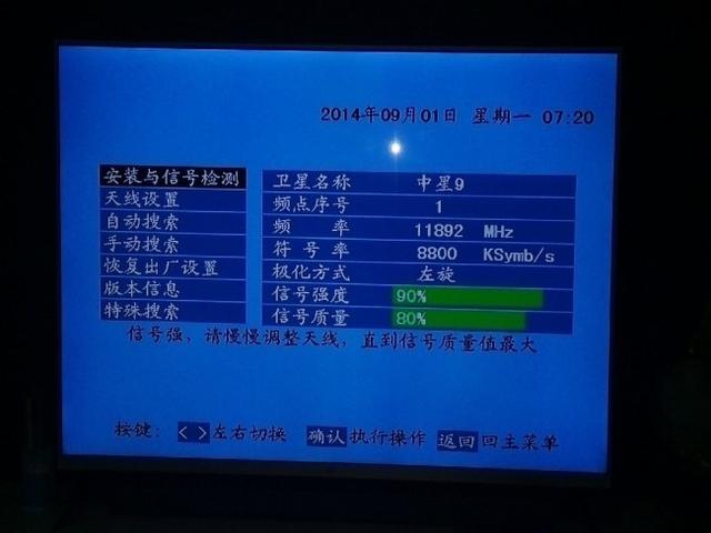 三、调试: 开始调锅;调整天线仰角及方位角。(一般只需要左右调节) 对天线进行方位角和俯仰角的初调整(北方大约是南偏西23.5度,仰角是54.2度,南方大约是偏西75度,仰角是54.2度),地方不一样,角度会不一样,初调整好了以后打开电视机和接收机的电源,把电视机调到AV(视频)状态 。 打开接收机边电视AV,按卫星接收机遥控,进入菜单-系统信号调试,确保信号强度变绿(无信号为红条),强度大于60%,同时确保信号强度变绿,我的信号强度为90%,信号质量80%-85%(据说最高有的信号质量为93%,对于中星9信号质量40%左右都可以锁定节目),这样我们可以看电视了。
