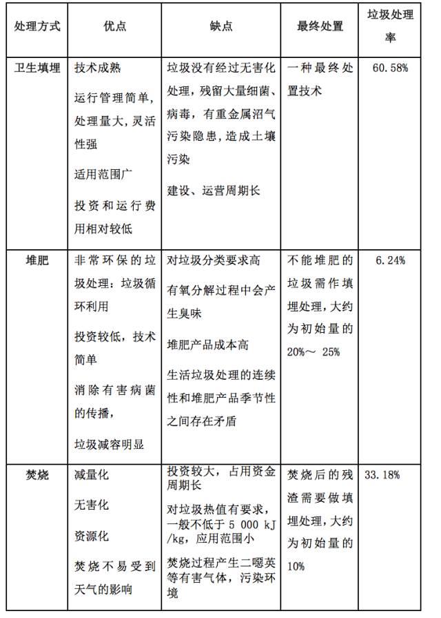 在中国,大部分大中城市从20世纪90年代起开始推广生活垃圾分类收集,但由于缺少相应的教育宣传,在未来很长时期内,我国绝大部分城市仍将采取混合收集的方式。然而,混合收集的方式对后续的垃圾处理造成极大压力。 一、垃圾处理方式 世界上垃圾常规处理工艺有填埋、堆肥和堆肥。发达国家和地区一般在分类收集的基础上,采用卫生填埋、焚烧和堆肥工艺,发展中国家仍大量采用简易填埋等方式。目前在中国,城市生活垃圾的处理主要还是以填埋为主,但是填埋技术、处理方式和管理水平有很大差异;堆肥和焚烧(15%)处理技术占的比例较小,垃圾处理能力较低,存在明显的地域性差异。近几年,焚烧的比例在不断怎长。以下表格梳理了三种常见的垃圾处理方式的优缺点以及它的垃圾处理率。 垃圾处理方式对比图