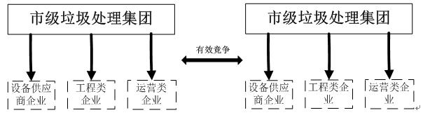 垃圾处理行业目前是典型的市场垄断行业。因此,横向的垃圾处理模式可以打破垃圾处理行业的市场垄断,打通各个城市的垃圾处理企业,开展有效竞(如下图)。这样一来,各个城市的垃圾处理行业不仅可以按照市场经济的原则自愿承接跨区域生活垃圾处理业务,并且有利于各公司改进管理水平和技术水平,同时形成一体化的垃圾处理行业市场,提高处理行业的运营效率。