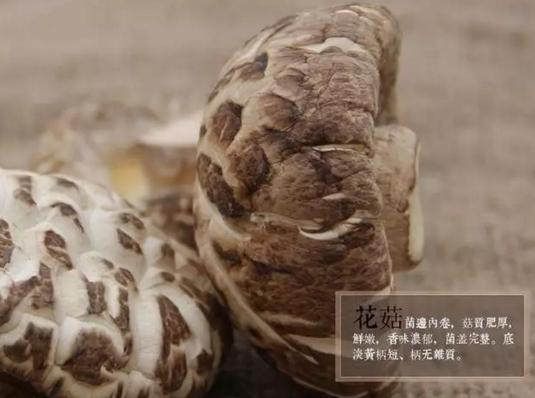 特级椴木花菇,生长在纯天然环境,以其味香质纯,冰肌玉洁而饮誉菇坛,又因其外形美观、鲜美可口而被称为席上佳珍; 一级白花菇,裂纹深而大,白色,质量最优; 二级茶花菇,在花菇形成过程中,如果受到雨淋,则初期裂开的花纹会逐渐愈合而变得不明显,呈现茶褐色,故称茶花菇或雨花菇。 三级花菇丁,菇蕾长出后,若是外界气候条件特别恶劣,就难以继续生长,而形成朵小、柄长,直径只有2厘米左右的菌盖,称为花菇西,质量较差。 三、吃花菇的好处 联合国粮农组织提出一个新的口号,21世纪最合理的膳食结构:“一荤一素一菇,”花菇的营养价值非同小可。 食用花菇能有效的促进排毒,还能给身体补充营养,让你一边减肥一边收获健康。