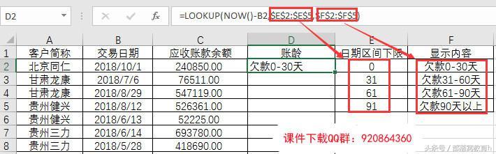 这里学到的LOOKUP公式属于一种自动分类套路公式。学会了它,再配合透视表的简单操作,很多原本非常麻烦的分类统计工作都可以变得非常简单。大家一定要了解、掌握这种方法! ****部落窝教育-excel制作账龄统计表**** |