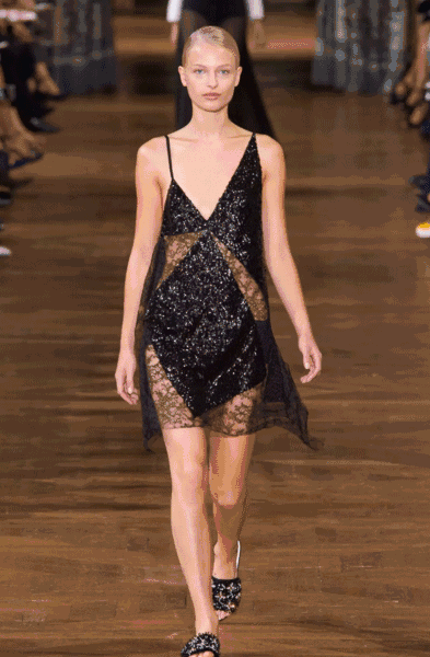 Lanvin 2017春夏系列:金碧辉煌的奢华吊灯、古典装饰主义装潢风格,弥漫着厚重的历史气息,亦真亦幻。与周遭的奢华感形成强烈对比的是 Jarrar 为人熟识的极简主义,以黑色、白色为主调,藏蓝、海蓝色、宝蓝色逐渐过渡装点其中,性感的透视和蕾丝震撼眼球,随性的条纹、精准的剪裁洋溢着凌厉的都市氛围,来的那么的摄人心魄。