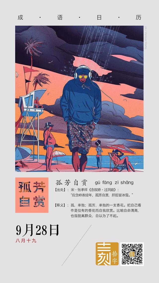 成语详解丨孤芳自赏 读音:gū fāng zì shǎng 出处:宋·张孝祥《念奴娇·过洞庭》:“应念岭表经年,孤芳自赏,肝胆皆冰雪。”