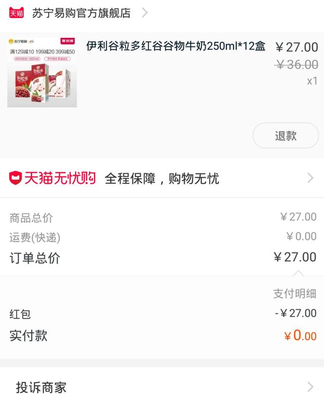 给大家展示下我最近撸的一些商品这一单是用每天兑换的红包购买是牛奶,12盒装的。