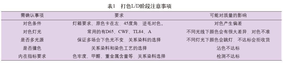质量控制的几个阶段 在订单进行的不同阶段,跟单员要从不同角度进行质量控制。 1接单推广阶段 1)了解客户的定位。 根据本企业的实际生产能力和设备状况来选择适合本企业的客户。例如:客户定位非常高端,而本企业设备又比较陈旧,在对针路要求、手感、光泽等质量根本达不到客户要求,则不要勉强接单。 2)了解客户质量要求,包括外观检验和内在测试。 有的客户要求所有的测试指标要达到要求,而本企业又受限于领导的管理理念、员工的操作水平、设备配套不全、 采购供应链不配套等方面原因达不到所有的要求时,接单就要慎重。 3)推销本企业擅长的品种。 对原料、染料不熟悉, 大货很容易出问题。 2打色L/D阶段 打色L/D阶段注意事项见表1。