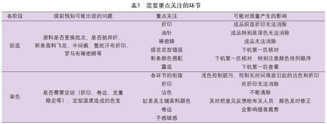 4下单阶段 1)跟单员代表着公司、代表着企业拥有者,是订单全过程的掌控者。其负有将客户的意图、对质量交期的要求等传达给企业相关管理者的责任。 下单时对重要的订单要组织生产质检等相关部门开会,介绍相关订单的情况、注意事项,向有关人员灌输客户的理念。一般生产部门都会有畏难情绪,对要求高的订单有抵触情绪,这时就需要企业负责人落实岗位责任,进行订单的产前动员。 2)落单及时,收到客户订单后要在第一时间开单下去,充裕的生产时间是生产质量的相关因素之一。 3)开单内容要详细。要对合同的质量要求理解吃透,把质量要求在生产通知单上充分准确体现出来。要有确认的品质样及详细资料。 4)各工序的注意事项及衔接过程应注意问题。 5生产阶段 一个优秀的跟单员必须具备对订单的每一个环节的把控能力。对生产过程的订单每一个环节都清楚了解。及时发现问题,对有问题的环节要主动去沟通、解决、向有关负责人反映。 缩水率、克重、色牢度,经常关注生产各阶段质量检查结果,注重头卷、头缸品质,头缸样取样时要在一缸布的中间取样。重点关注各阶段(见表3)可能出现的大的问题,特别是一些工艺不成熟的新产品大货生产。在头缸样出来后第一时间交给客户确认,有问题及时反馈。
