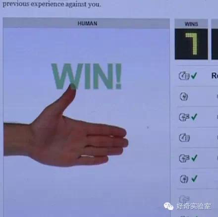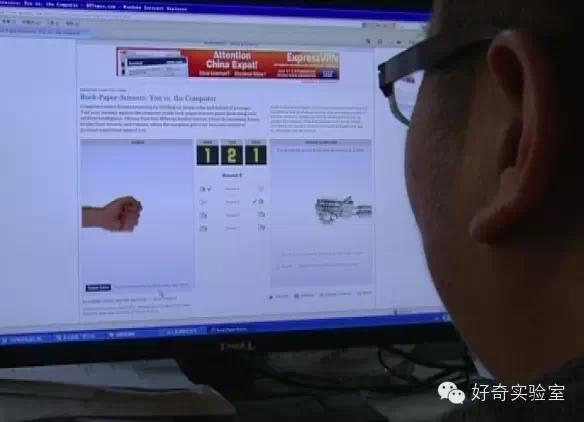 世界上最强的石头、剪子、布高手,就是这个页面上的机器人手,这只手的后面是收集了超过20万场剪刀石头布比赛的数据库,它永远会知道你接下来会出什么拳,接下来,小胖要跟它玩一场PK。 初级难度,小胖的成绩是赢18局、平18局、输14局。 高级难度,小胖以18胜、16平、16负,险胜。