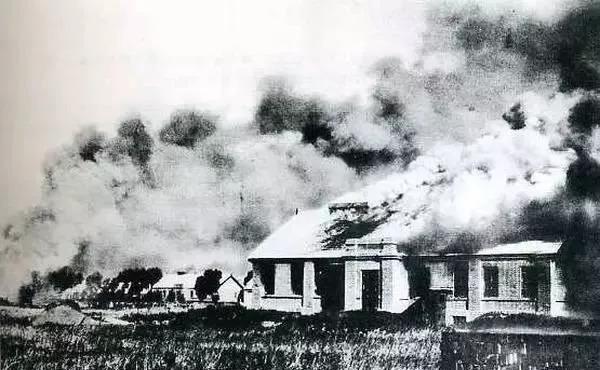 1931年9月18日夜,日本关东军炸毁沈阳北郊一段南满铁路的路轨,制造借口进攻中国东北军驻地北大营,发动了“九一八事变”。图为烧毁中的北大营。