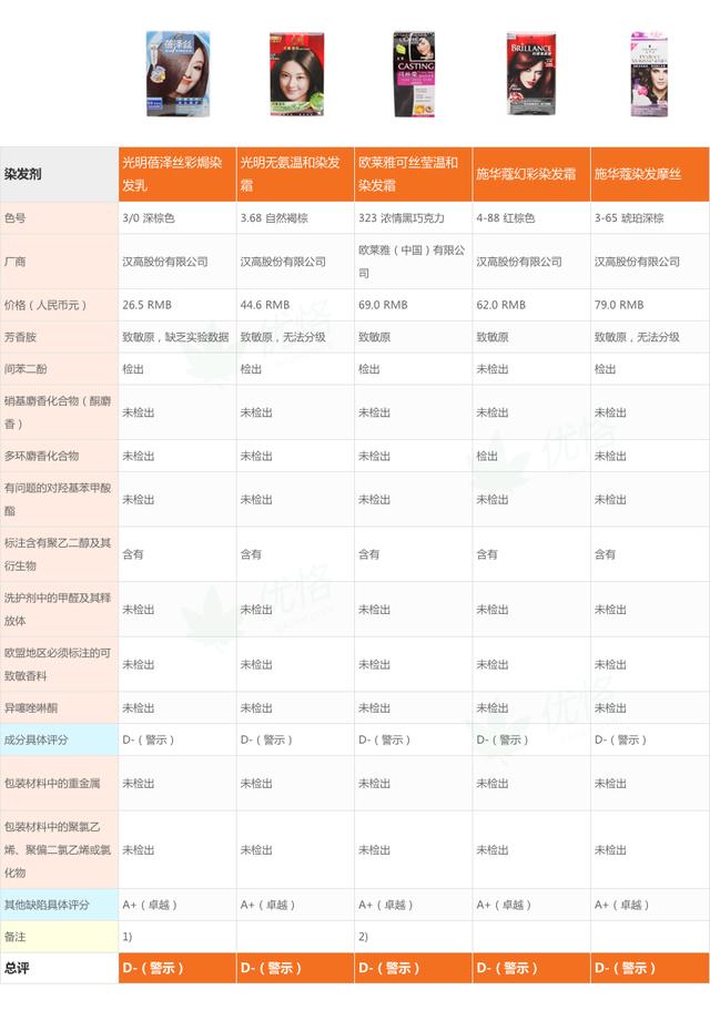 优恪网(okoer.com)此次送检的10款染发霜评级全部为D-(警示),常见品牌欧莱雅、施华蔻、美源、丝蕴、温雅、光明等无一幸免。 芳香胺、间苯二酚、人工合成麝香化合物、聚乙二醇及防腐剂等多种原因导致此次测评惨败的结局。所幸致癌物二恶烷、甲醛和可致敏芳香剂等成分,并未检出或只是在痕量范围内检出。 两款染发剂检出易致敏物芳香胺 本次送检的10款产品均为化学合成染发剂,也称为氧化型染发剂,这类染发剂通过调整染料前体和偶联剂的种类、含量及配比,以得到不同的颜色。 所有10款产品均因芳香胺类化合物而被扣分。其中美源发采快速黑发霜和欧莱雅卓韵霜赋活养护染发霜,更因分别检出芳香胺化合物中风险更大的对氨基苯酚盐酸盐和对氨基苯酚扣分较多。中文核心期刊《色谱》刊文称,世界卫生组织研究表明,长期使用含有氨基苯酚类物质的染发产品可导致头发脱落、皮肤过敏;同时该类化合物因具有雌激素效应,易危害生殖系统的健康。 华东理工大学精细化工系主任王利民教授告诉优恪网(okoer.com),作为染发剂中常用的染料,一般而言,芳香胺中间体直接接触皮肤可能存在致敏等风险,若长期接触可能还会产生更严重的后果,因此建议减少染发次数。 除欧莱雅卓韵霜赋活养护染发霜和施华蔻幻彩染发霜两款产品外,其余8款产品均检测出间苯二酚。王利民介绍,间苯二酚作为染发剂的显色剂之一,和芳香胺配合使用,经氧化后才能产生颜色,长期低浓度接触,可能会刺激皮肤及呼吸道;该成分已被列入2015《职业病危害因素分类目录》(公开征求意见稿)。